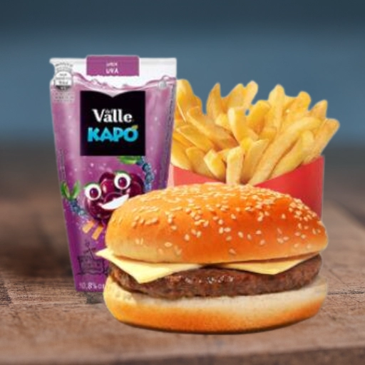 Pão especial, hamburguer kids, alface, tomate + Batata frita de 130g + Maionese, ketchup e mostarda heinz + Refrigerant... Ver completo